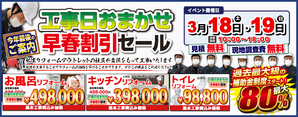 工事日おまかせ早春割引セールを全店舗同時開催いたします。
