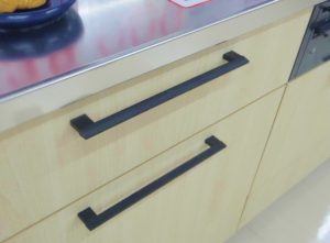 全体的に春らしいナチュラルなカラーのキッチンをこちらの取っ手がぴりりと引き締めていて、